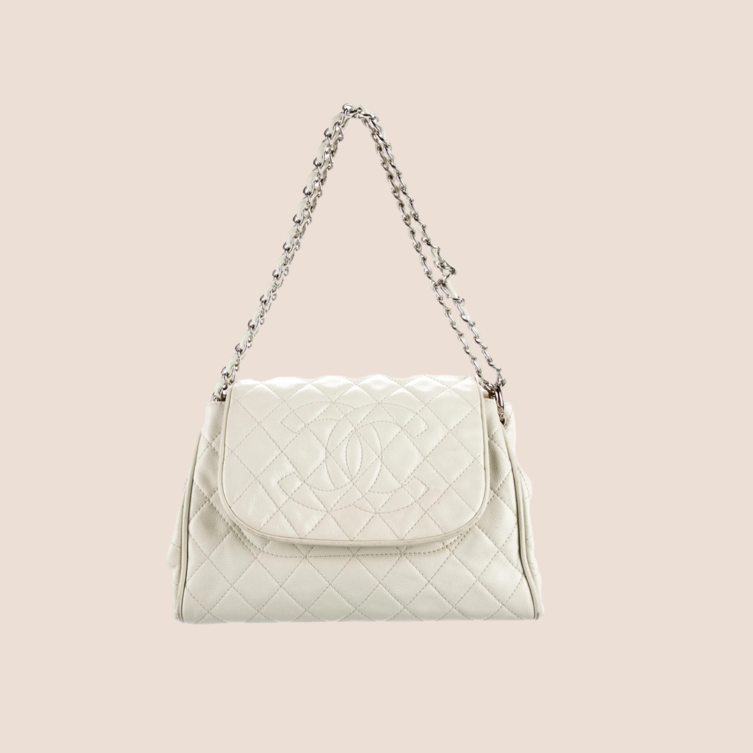 The bag features quilted white leather body, silver-tone hardware, canvas lining & flap closure at front.