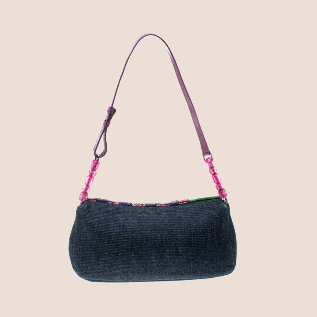 The bag is made of denim and decorated with colorful silk and beads. The bag features an adjustable shoulder strap, one interior compartment and one inner zip pocket.