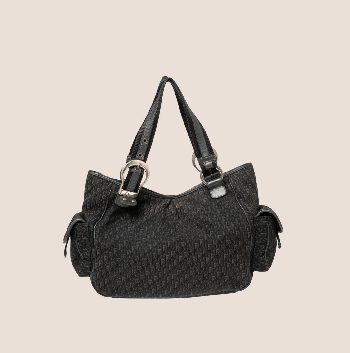 Vintage authentic Christian Dior Black & Grey Diorissimo Canvas & Leather Street Chic Multipocket Buckle Satchel.