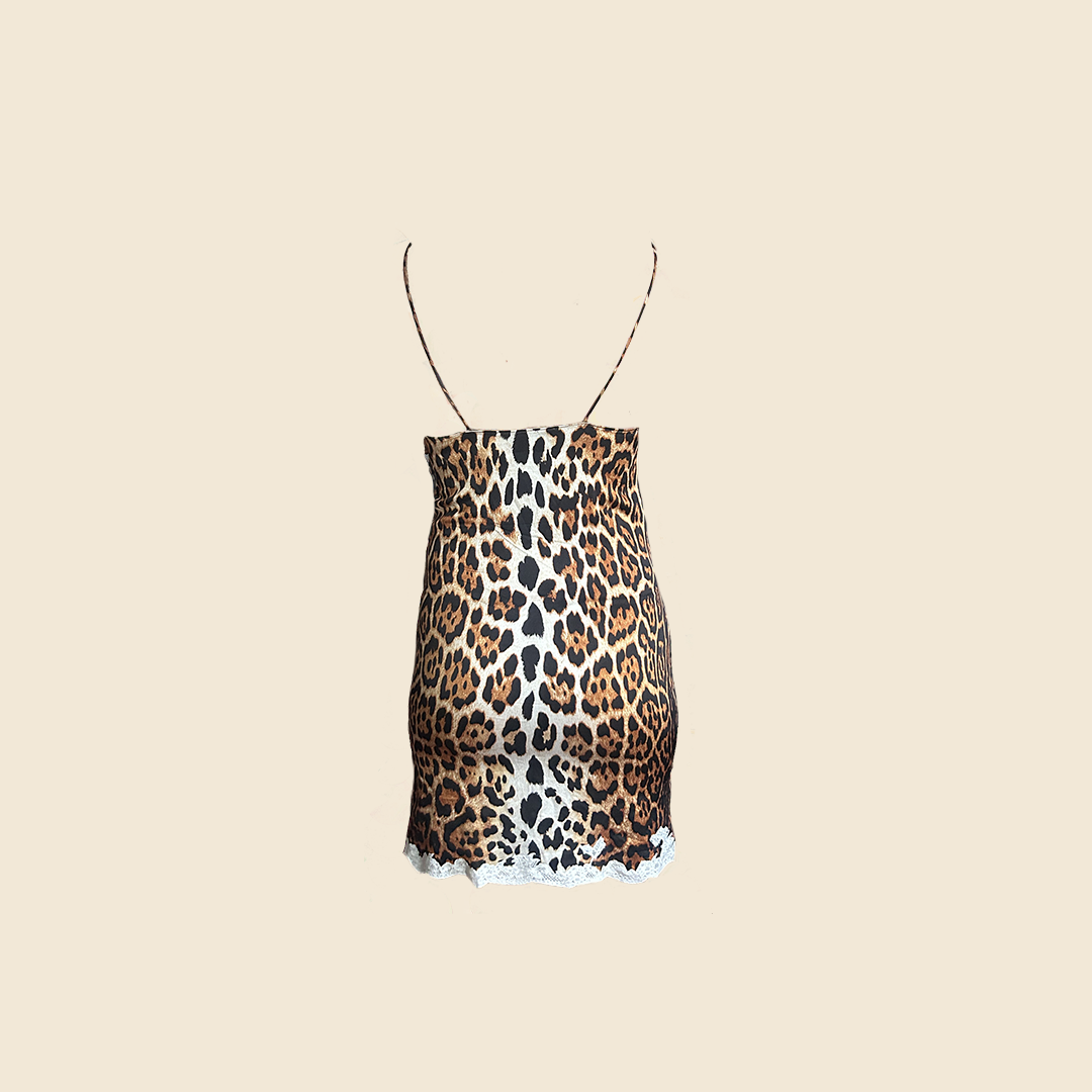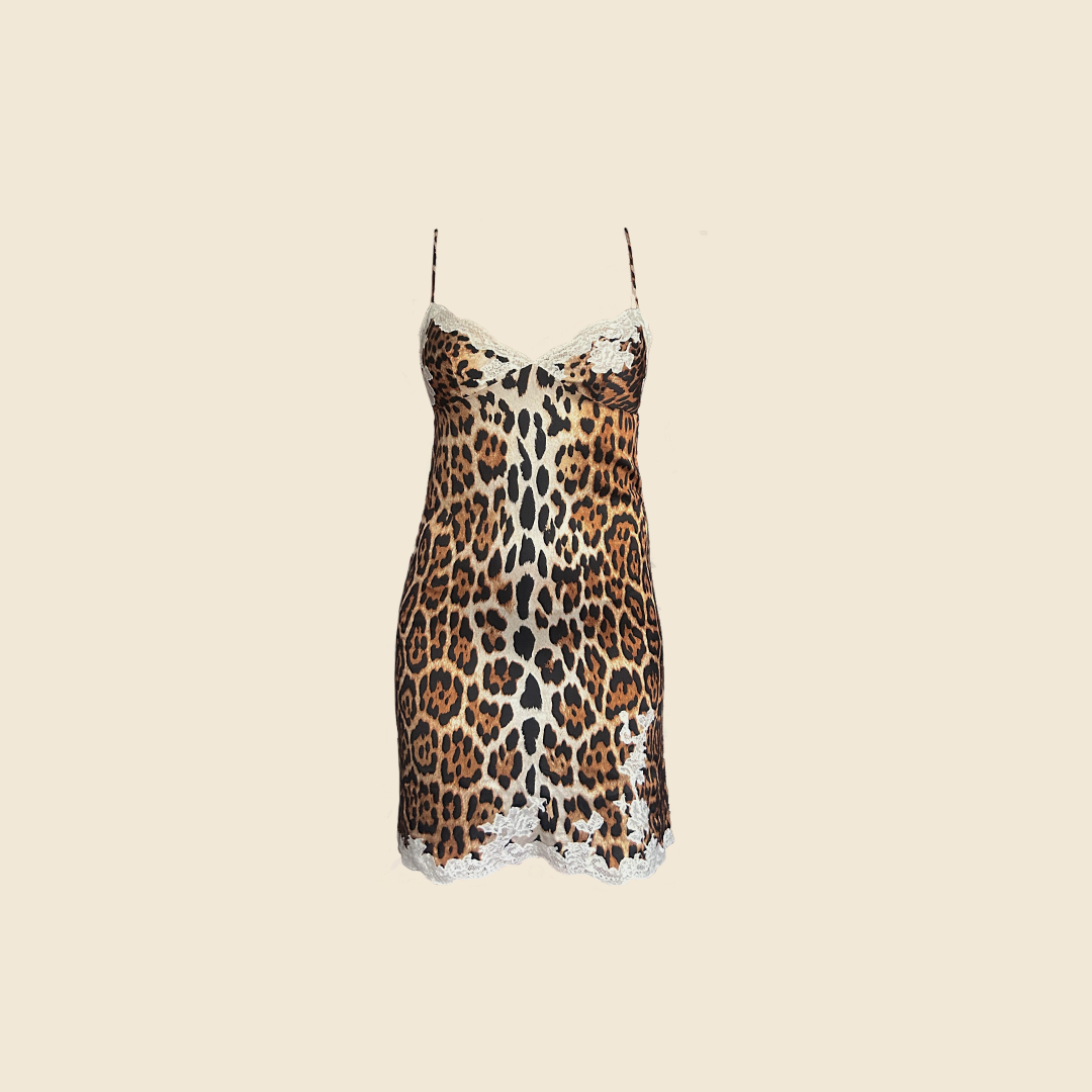 Vintage authentic Christian Dior Spring 2008 Silk Leopard Print Mini Dress with lace details.