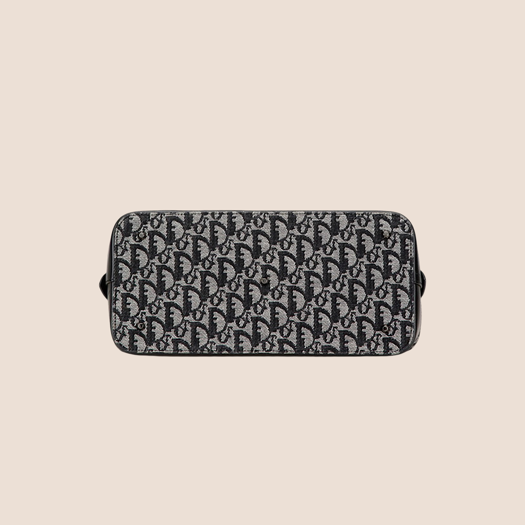 The bag features Diorissimo pattern, silver-tone hardware, rolled handles, leather trim embellishment, nylon lining, dual interior pockets, zip closure at top & protective feet at base.