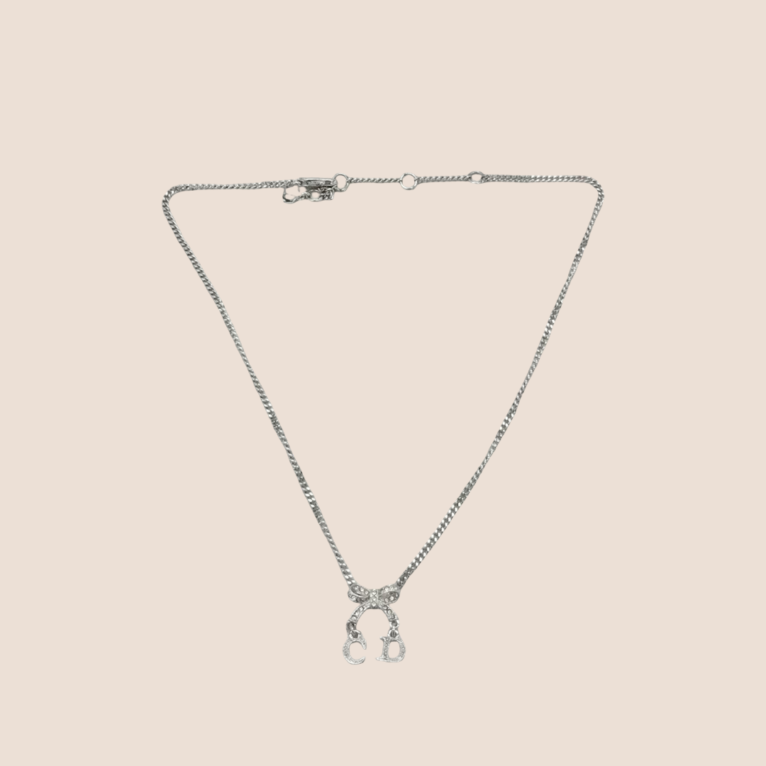 CHRISTIAN DIOR SILVER CRYSTAL INITIAL BOW PENDANT NECKLACE