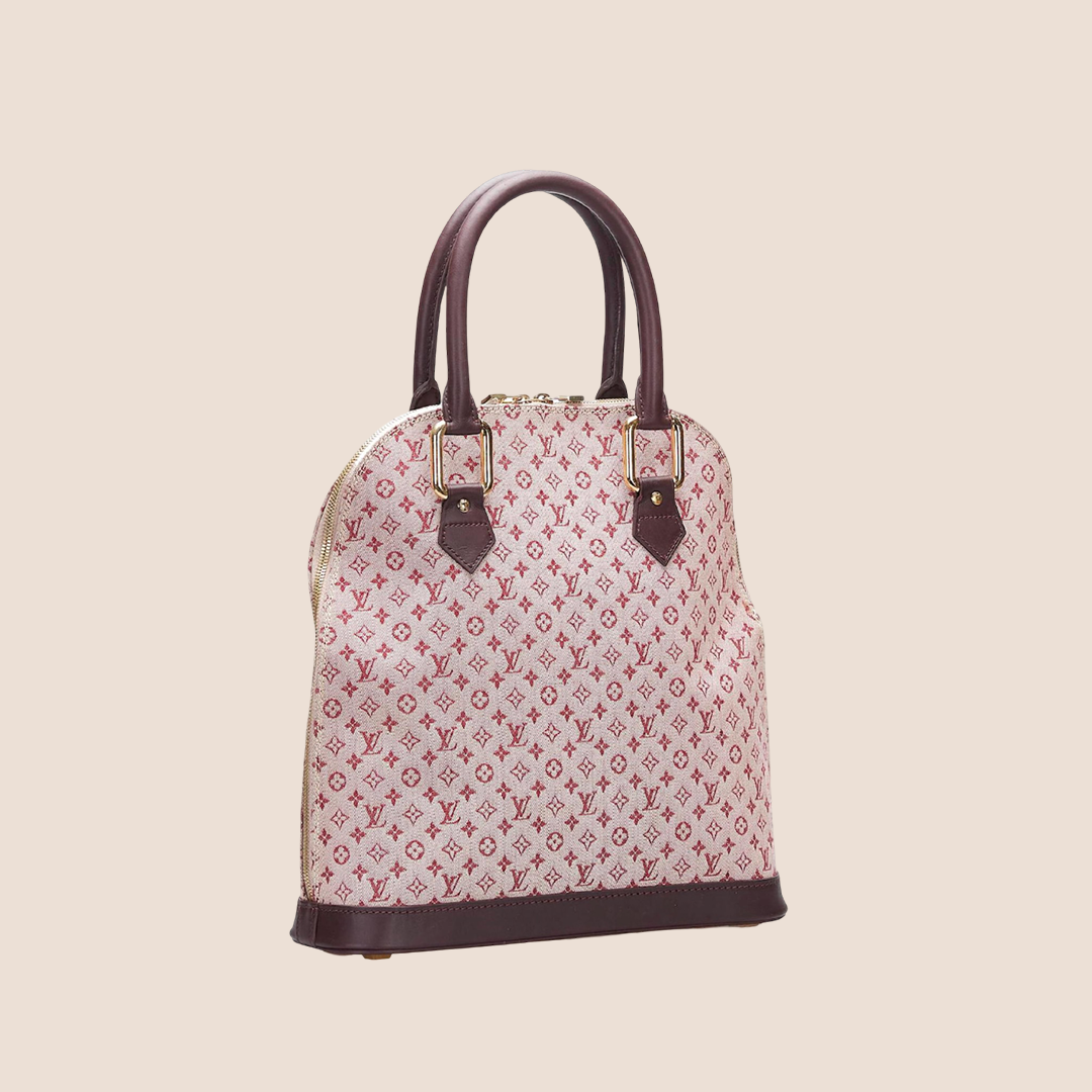 Vintage authentic Louis Vuitton Burgundy & Pink Monogram Mini Lin Alma Haut handbag.