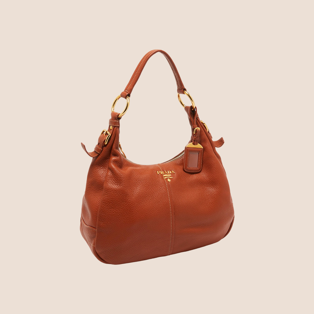 PRADA BROWN VITELLO DAINO LEATHER ZIP HOBO BAG